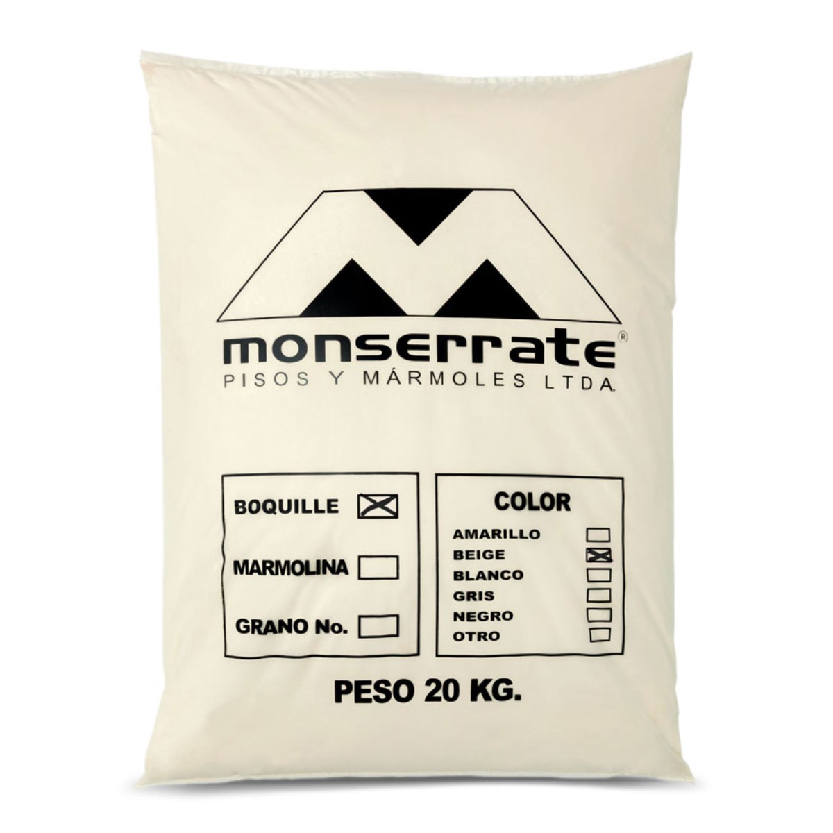 Material fabricado por Monserrate que incorpora aditivos y pigmentos idóneos según la referencia de la Baldosa. El Boquille cumple dos funciones: una estética, rellenando tanto las uniones como los posibles pequeños desperfectos ocasionados a los bordes de las baldosas durante su manipulación y colocación; y una técnica, dando a la unión cierta flexibilidad de absorción de movimientos de asentamiento y dilatación.