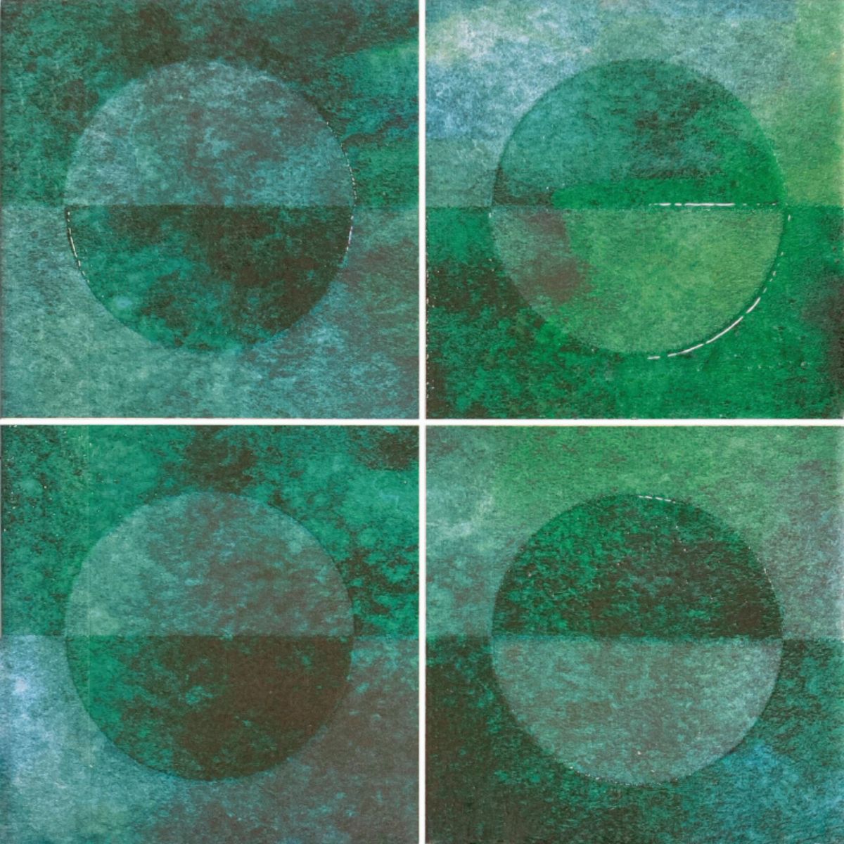 Baldosa cerámica para piscina con diseño abstracto en tonos verdes que combina círculos superpuestos creando un efecto orgánico y dinámico. La mezcla de verdes en diferentes intensidades aporta profundidad visual y un carácter único a cada instalación. Perfecta para proyectos de diseño contemporáneo.